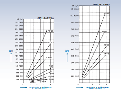 載荷-延伸圖顯示了鏈條的彈性,即超出絕對延伸的力曲線(類似于應(yīng)力-應(yīng)變圖)。最大值約為抗拉強(qiáng)度的 50%,因為這涵蓋了滾子鏈應(yīng)用的典型范圍。